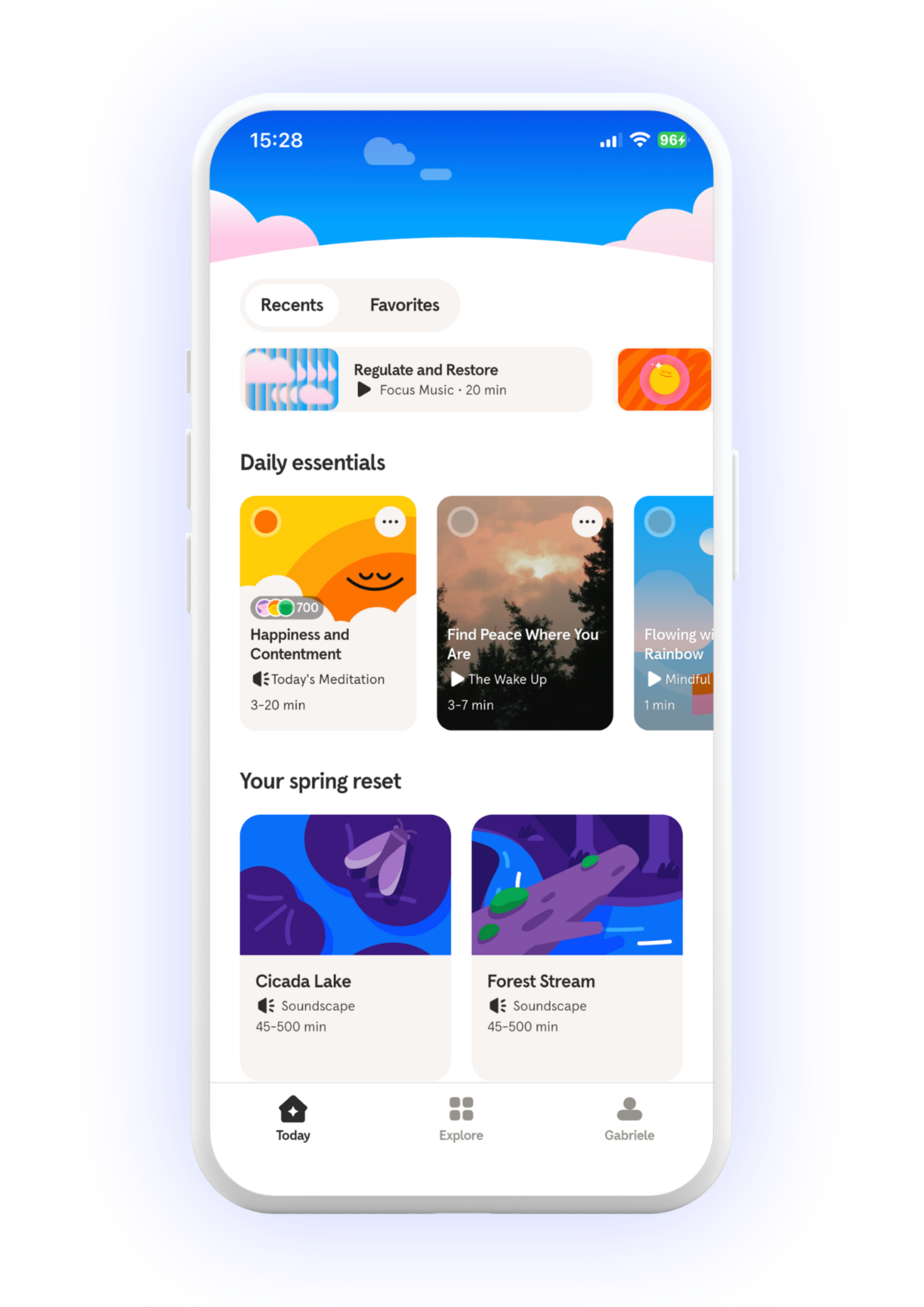 Example in the image: the Recents/Favorites toggle, the small horizontal audio card, the large section headers, and the content cards all share attention without a strong primary CTA.